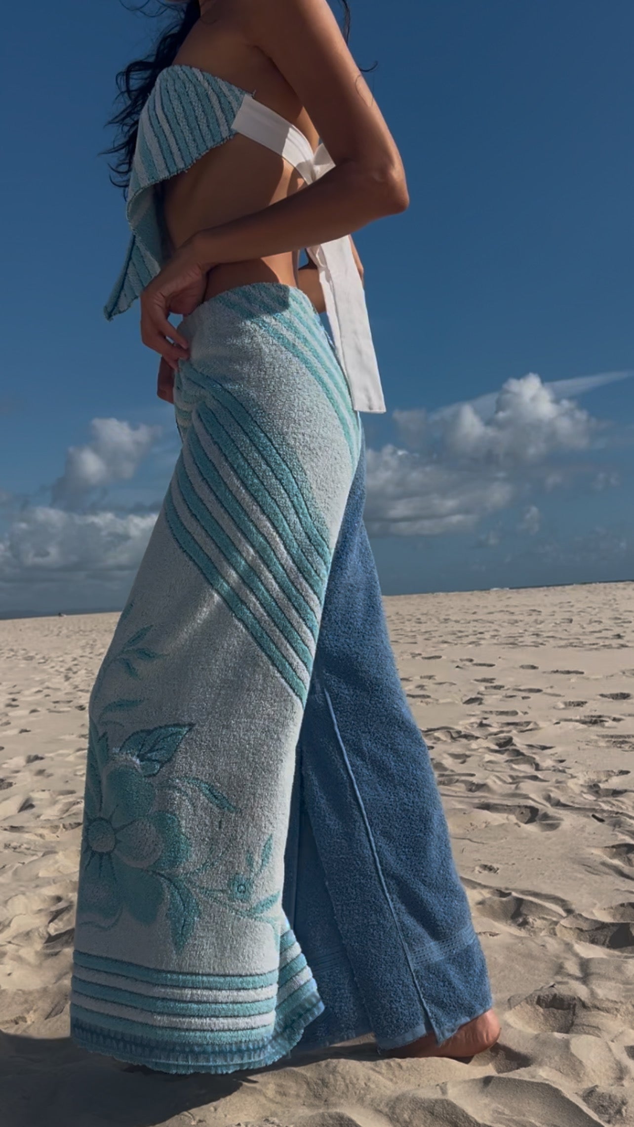 Crafted from 2 Vintage towels, Inspired from not wanted to cut into this rare textiles, and ruining the placement prints. These pants have been tailored to fall beautifully to frame the towel prints. Non roll elastic at waist with internal casing. Every pair is hand cut individually from vintage towelling pre dating 1980. Made in Byron Bay were seamstress are paid for their craftsmanship, which is reflected in the price. These are one of a kind and can not be replicated.