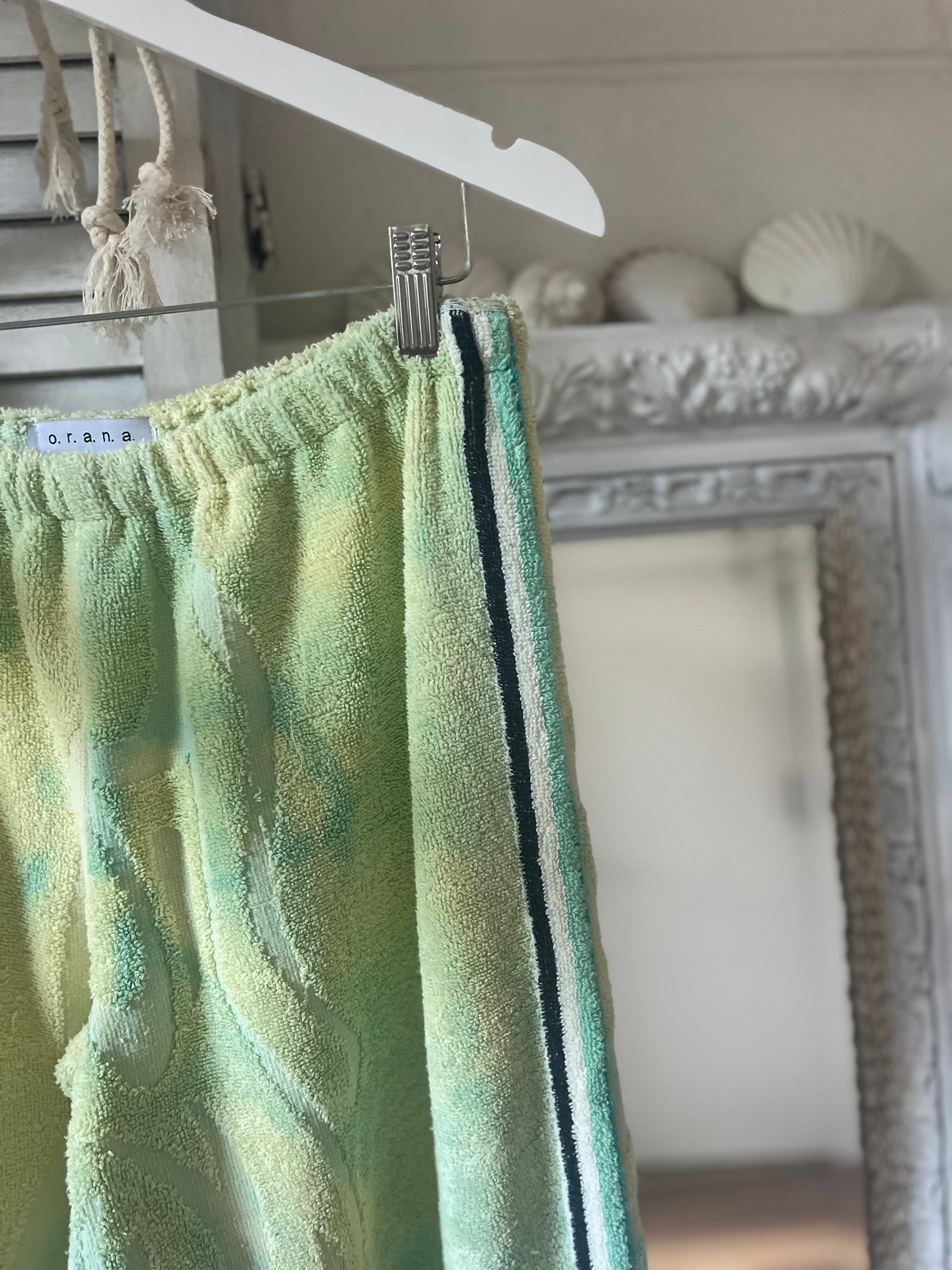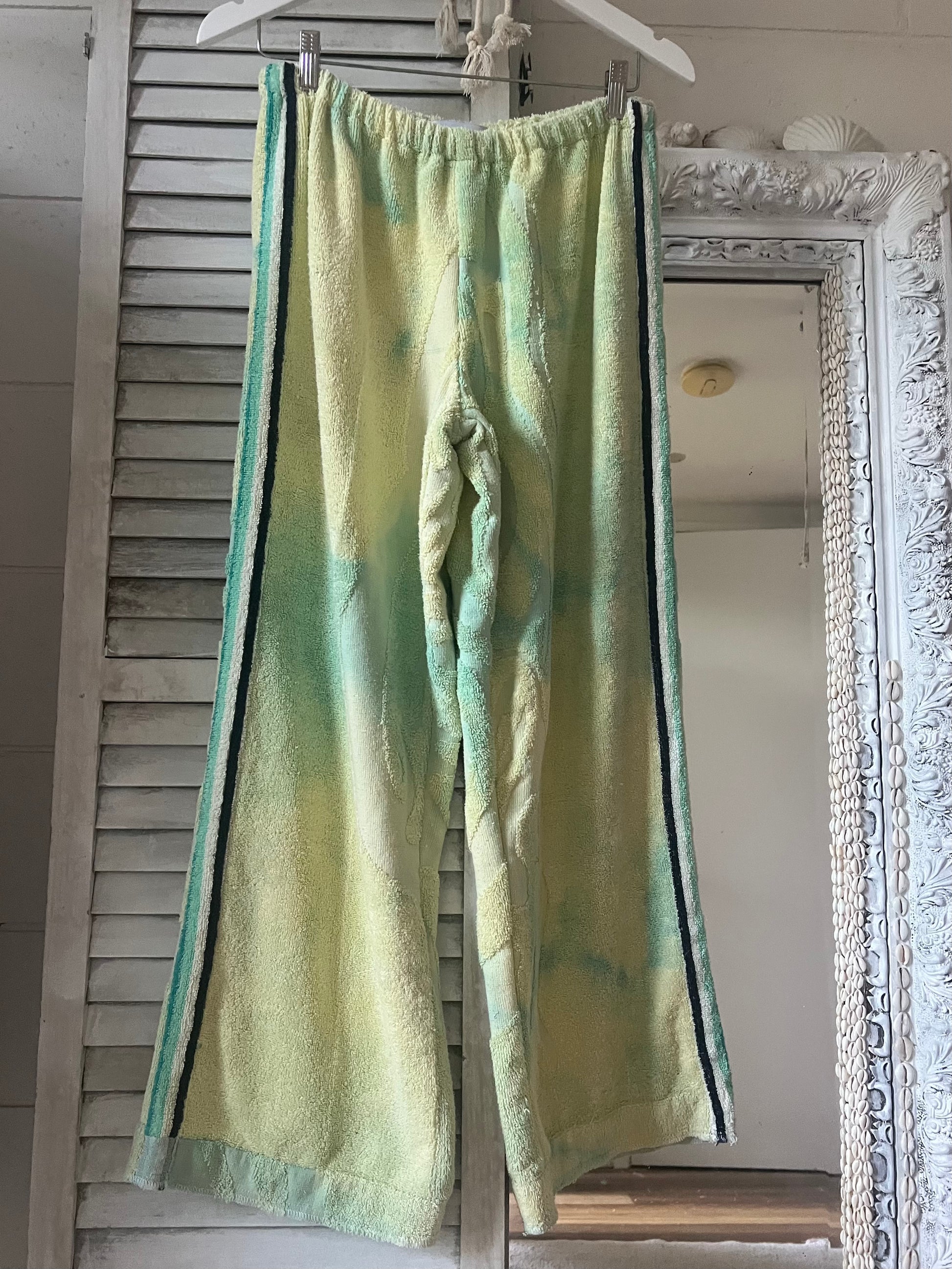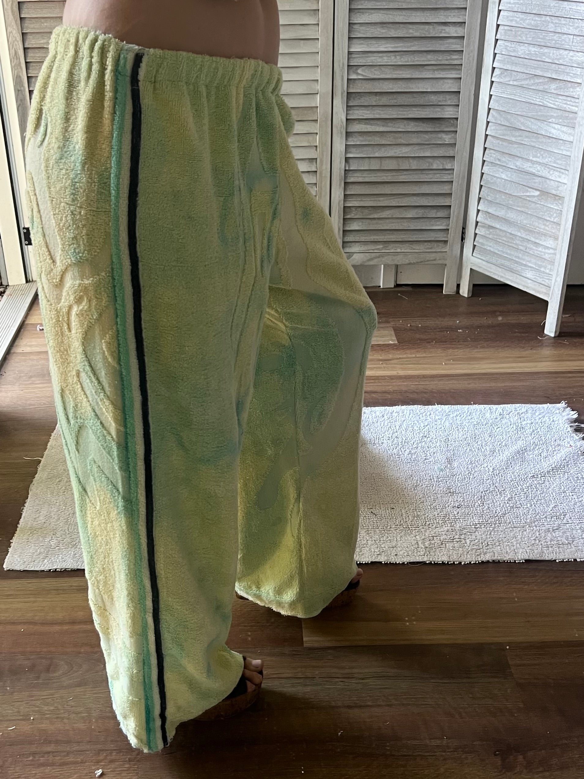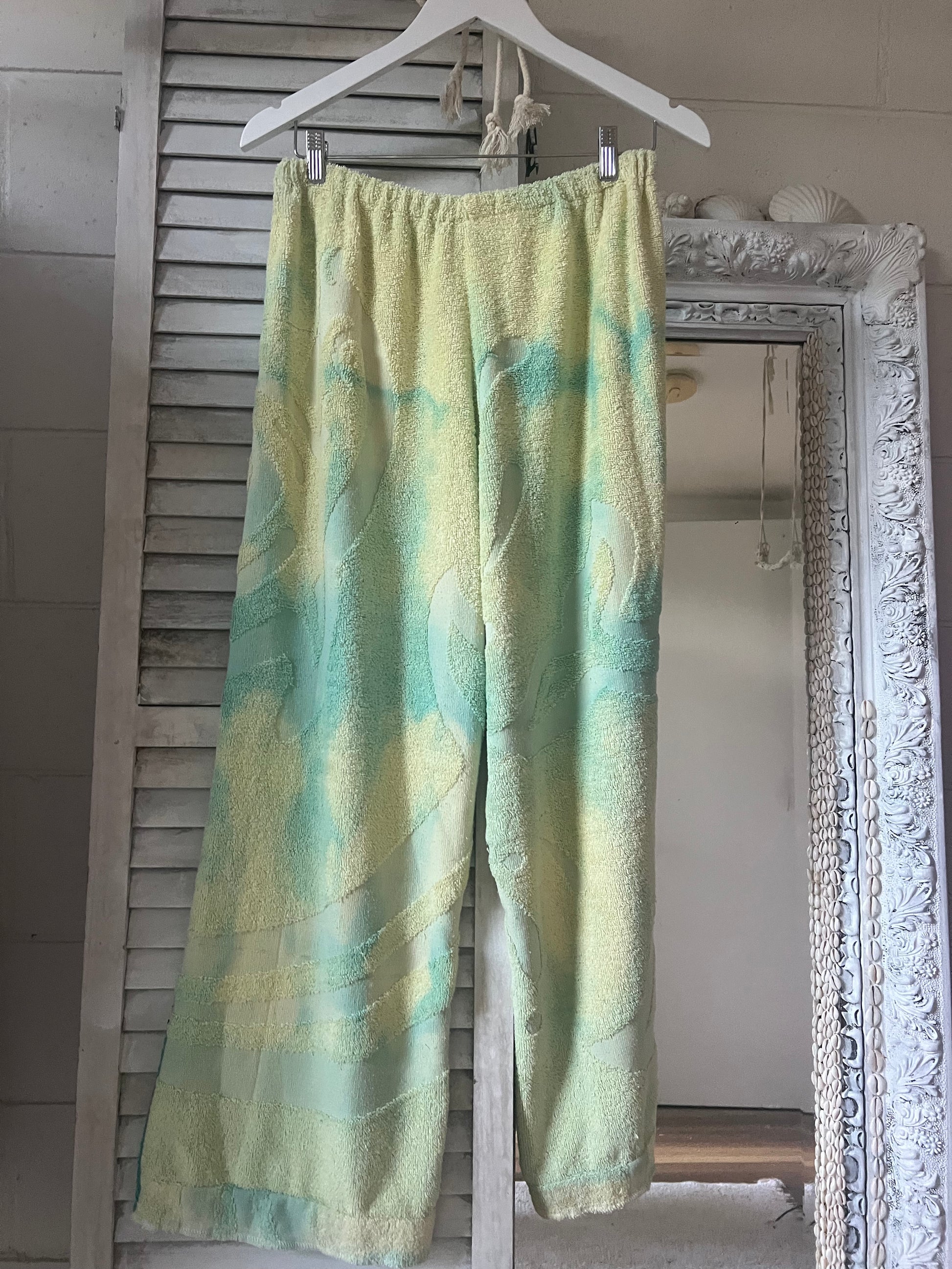 Size S-M Up cycled 100% cotton velour towelling. WAIST RELAXED 36cm *WAIST STRETCHED 50CM *THIGH 36.5cm *SIDE SEAM LENGTH 97CM. Longer length. If you are a smaller size, elastic can be adjusted.