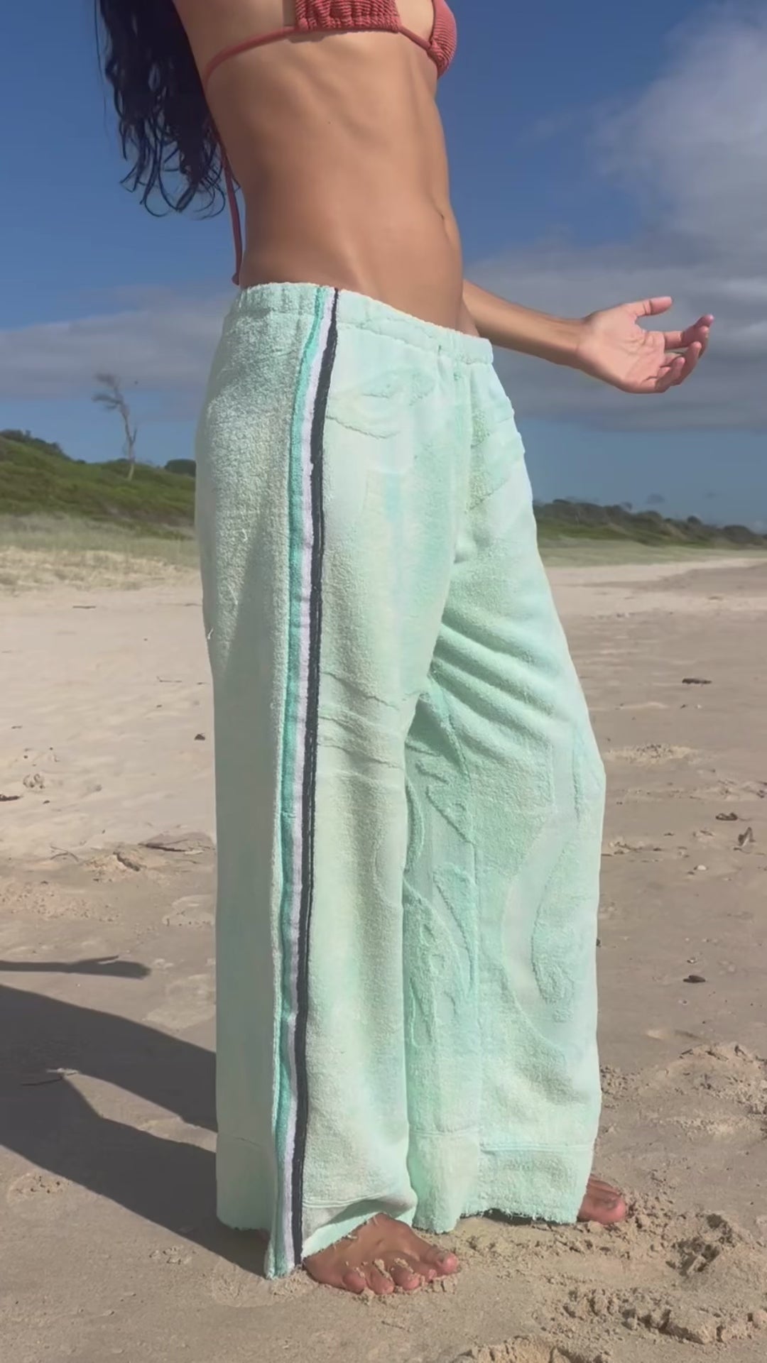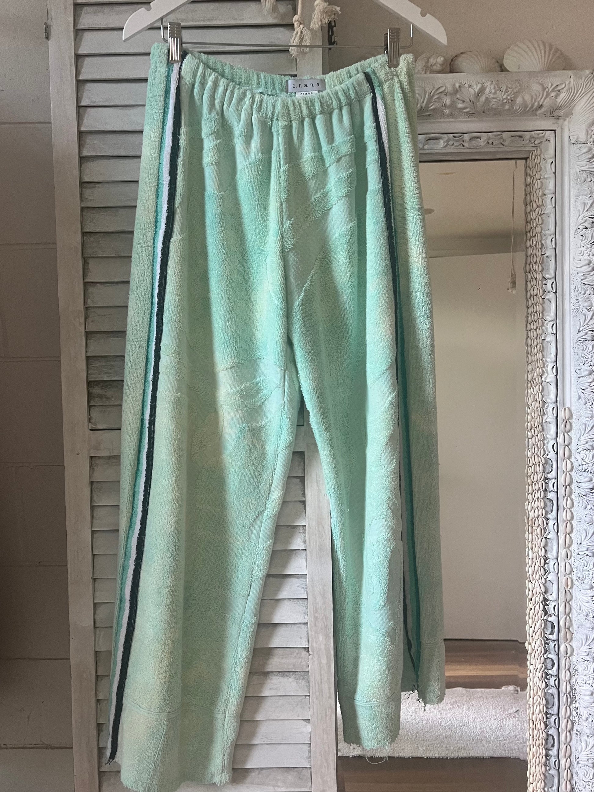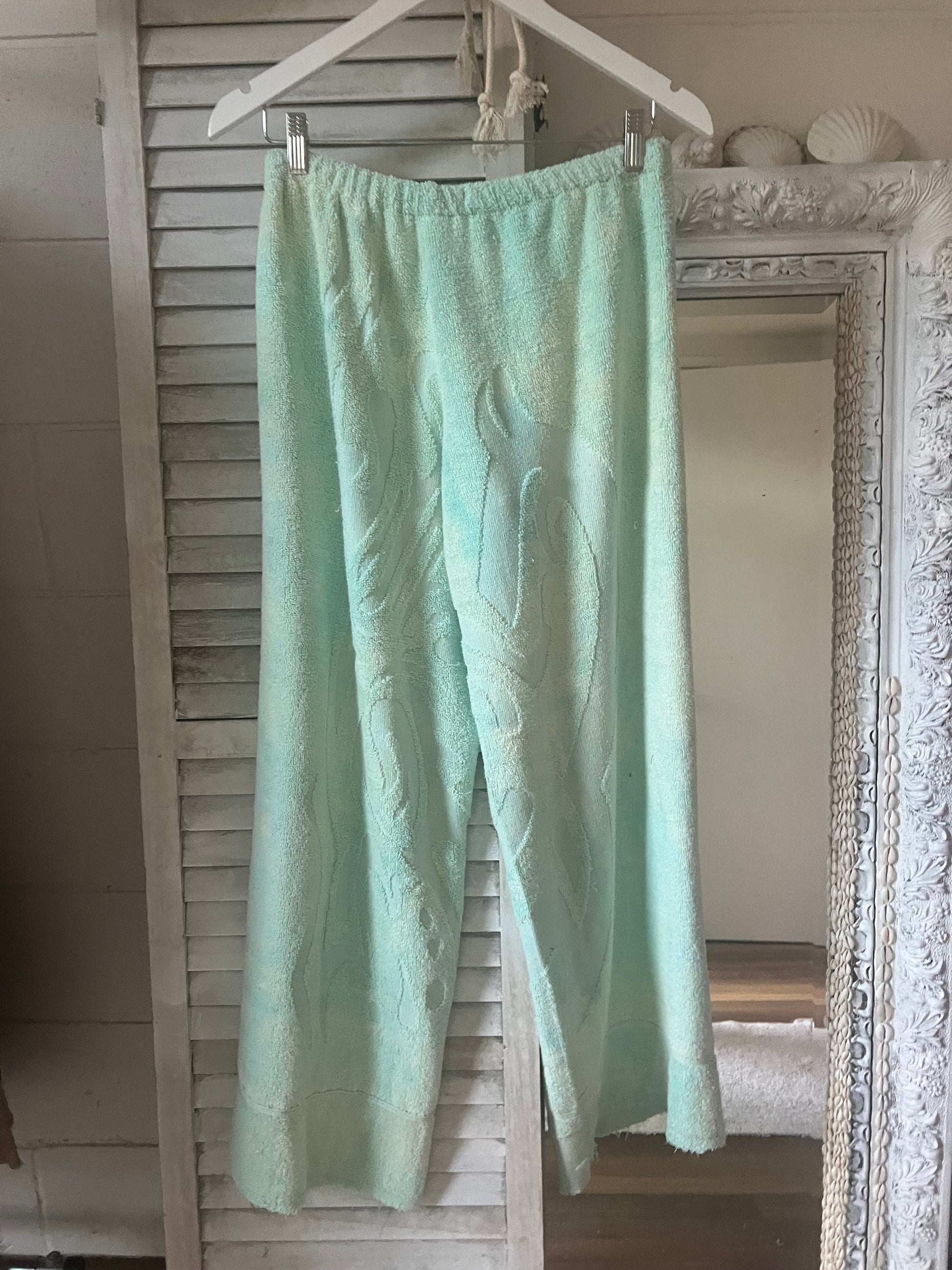 Size S Up cycled 100% cotton velour towelling. WAIST RELAXED 36cm *WAIST STRETCHED 50CM *THIGH 36.5cm *SIDE SEAM LENGTH 97CM.