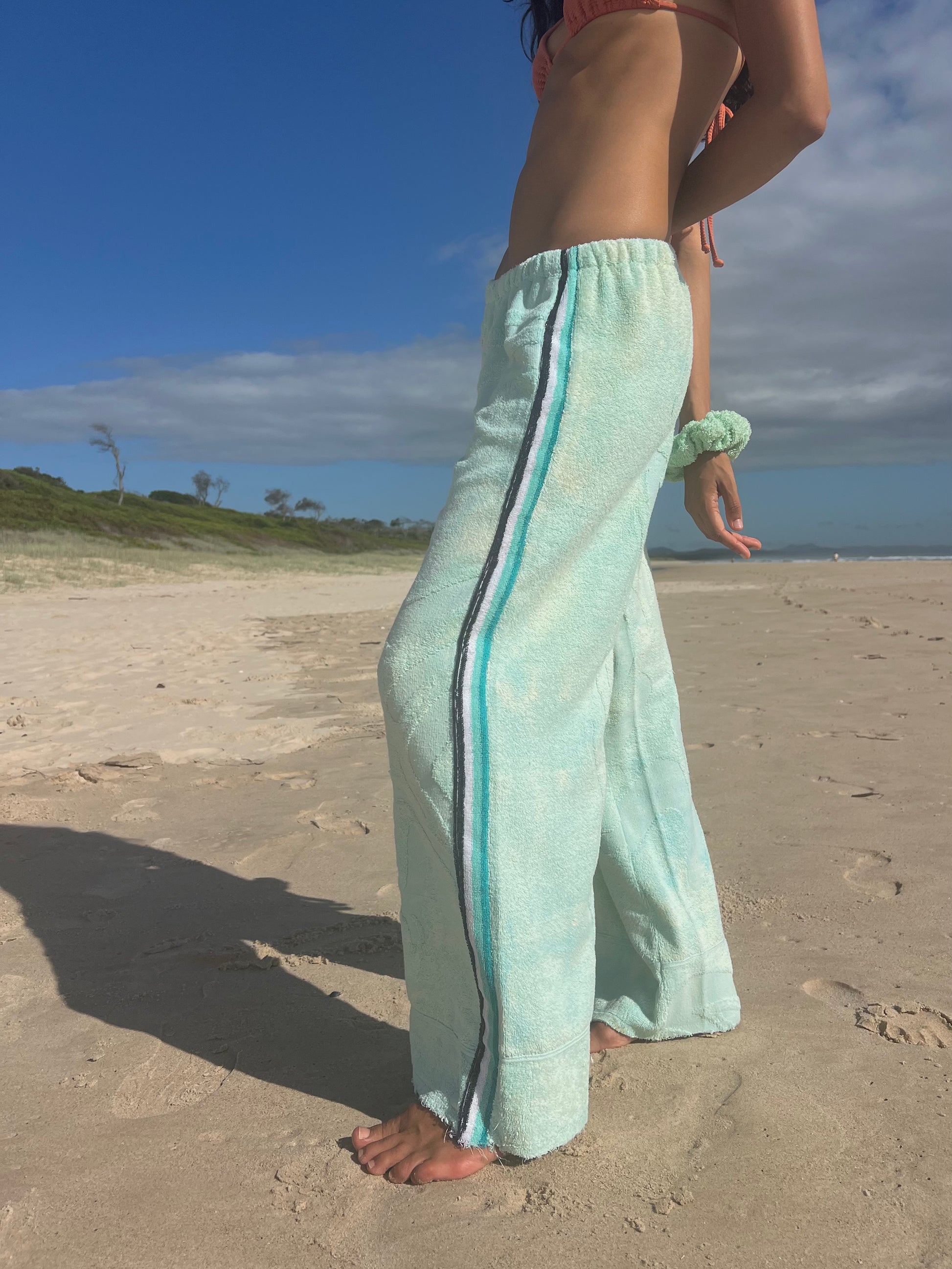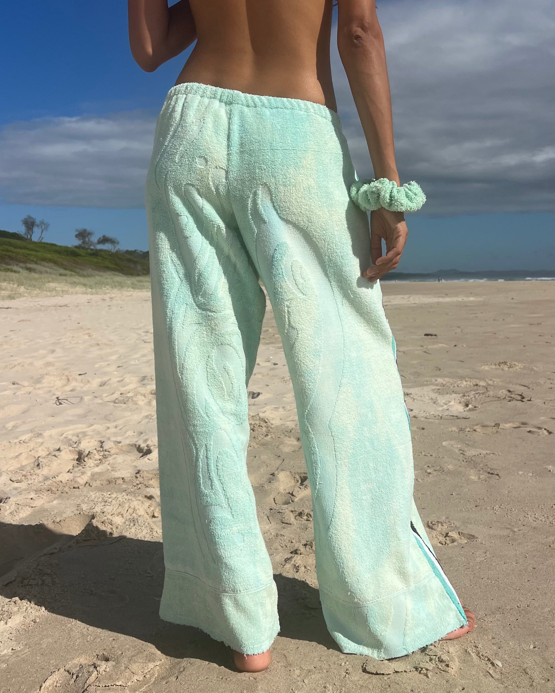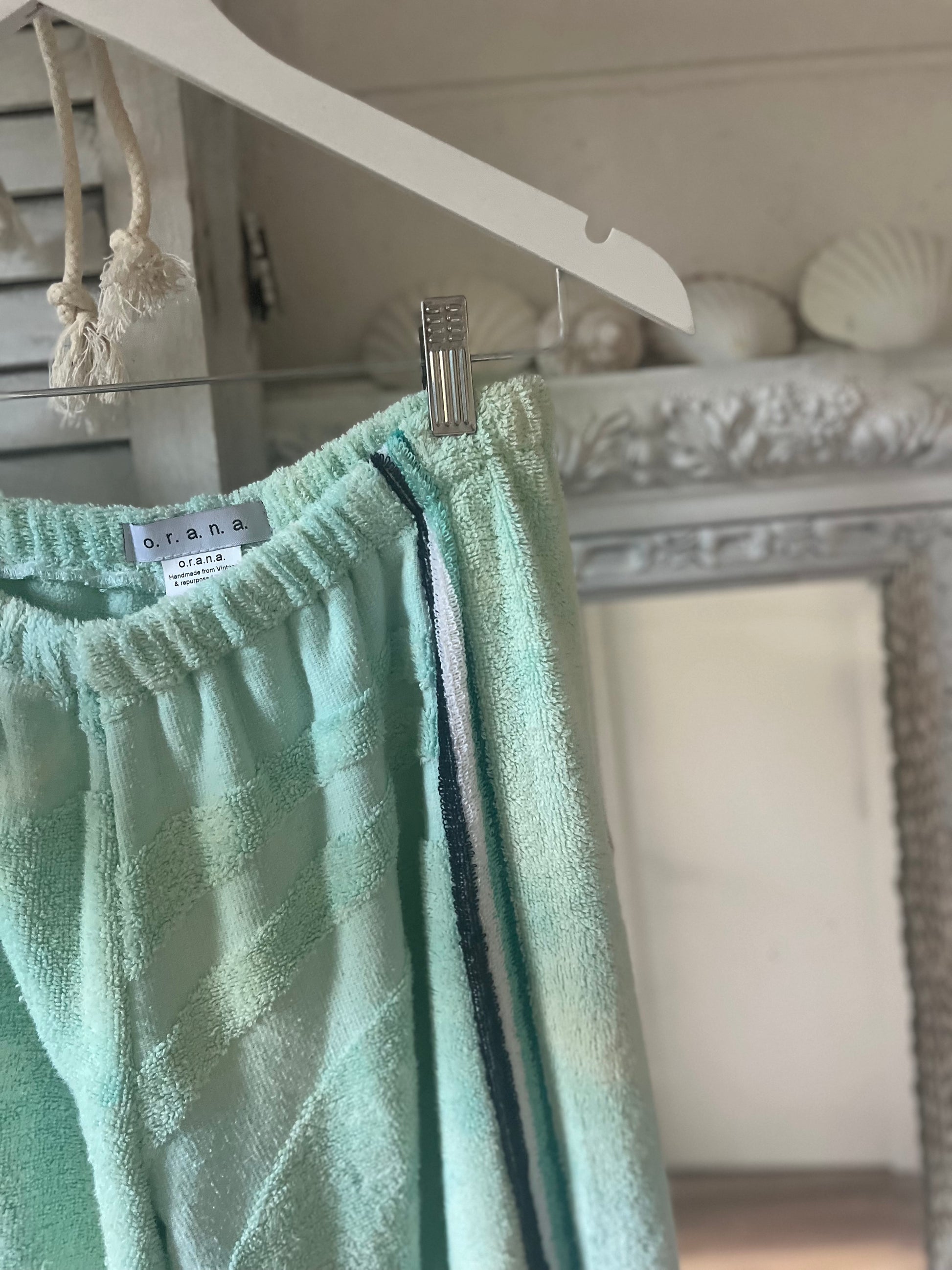 Size S Up cycled 100% cotton velour towelling. WAIST RELAXED 36cm *WAIST STRETCHED 50CM *THIGH 36.5cm *SIDE SEAM LENGTH 97CM.