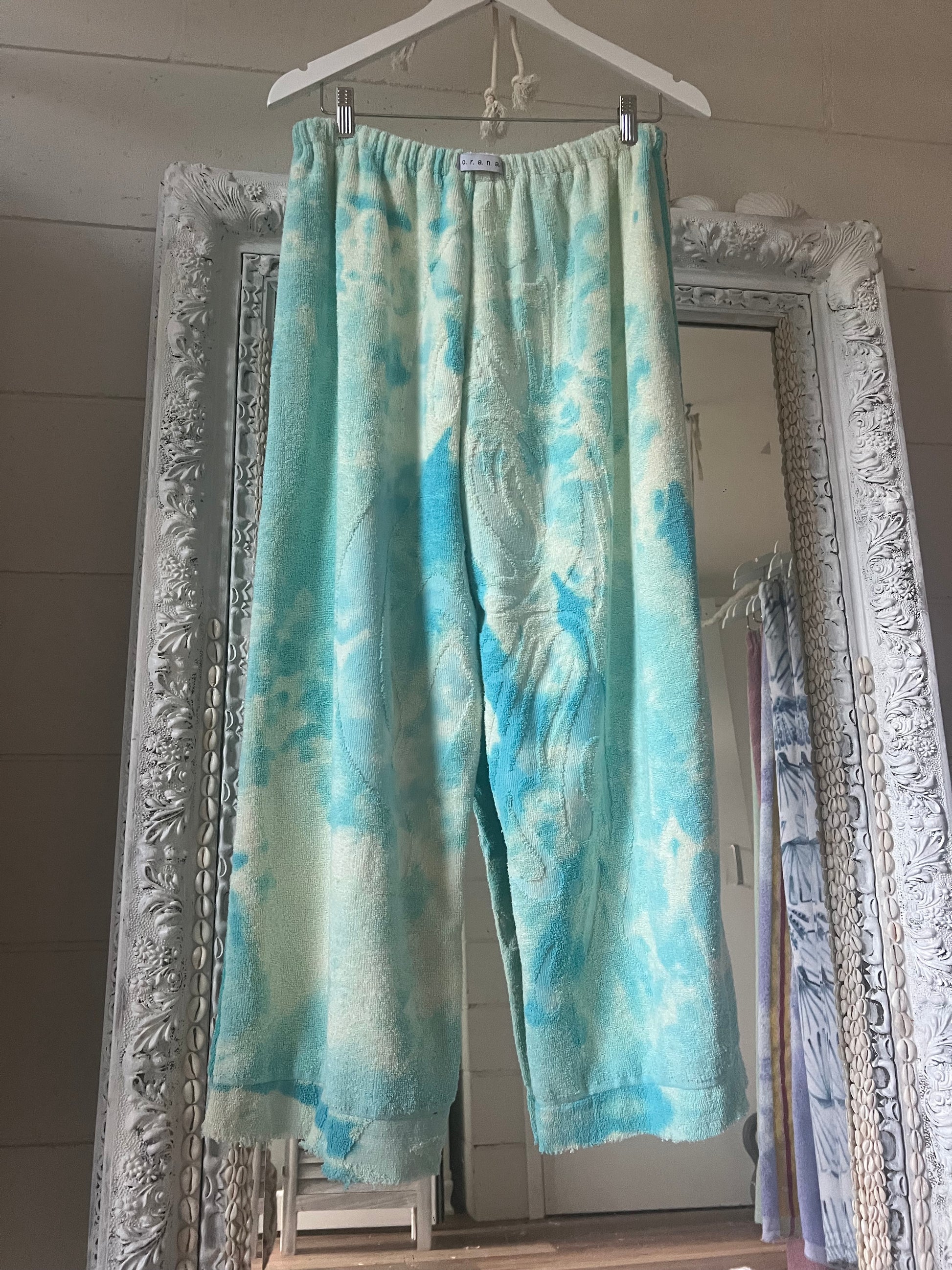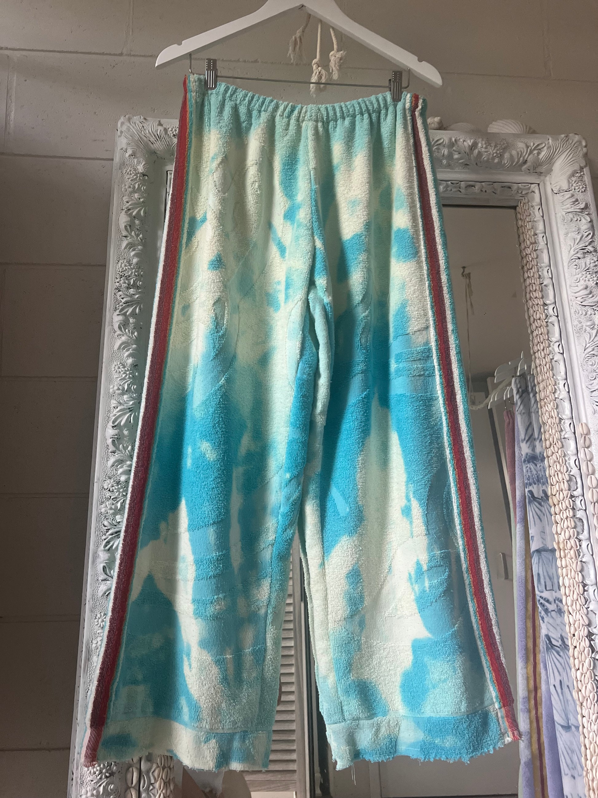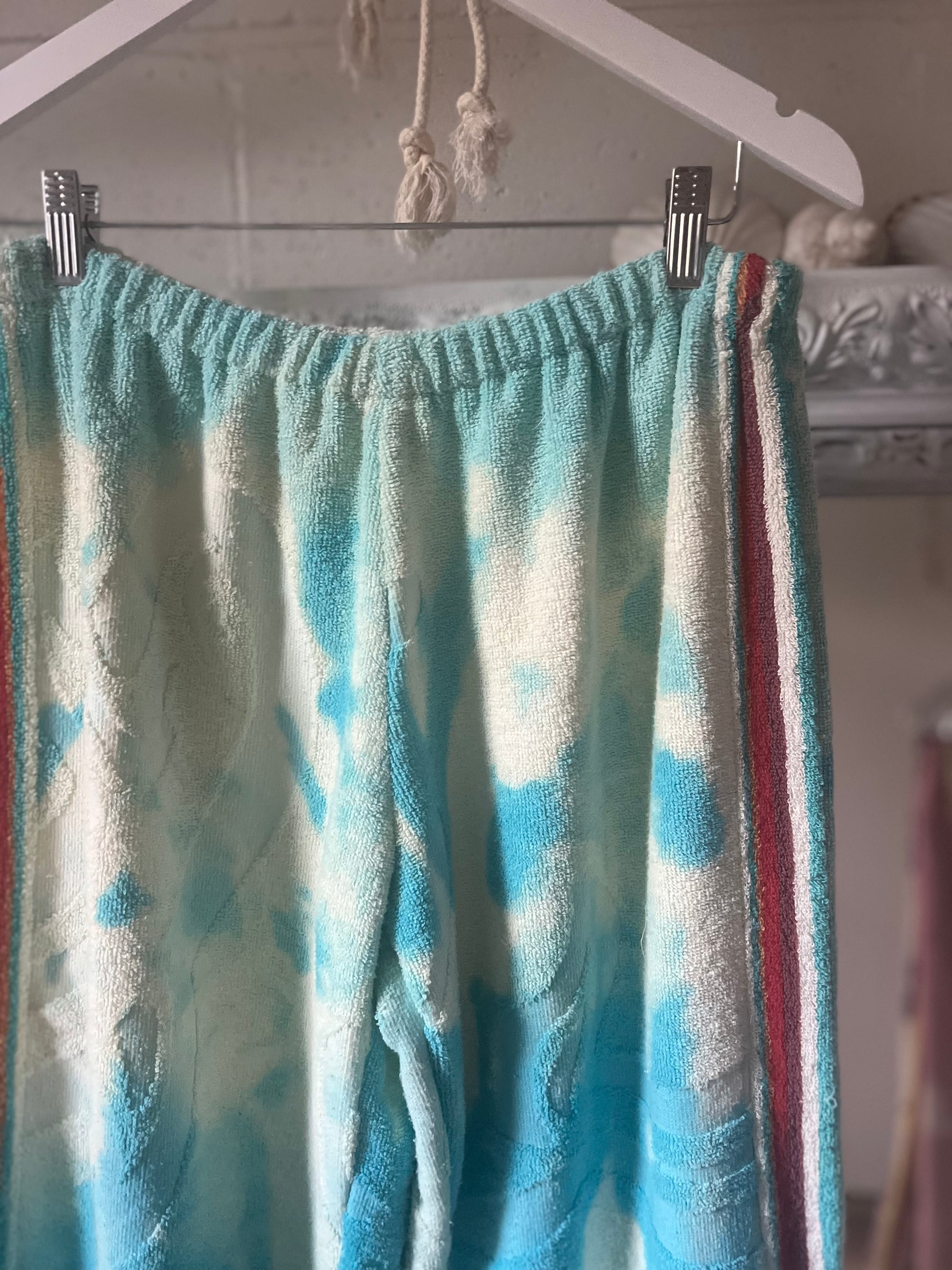 Size M -Petite length Up cycled 100% cotton velour towelling. WAIST RELAXED 39cm *WAIST STRETCHED 54CM *THIGH 37cm *SIDE SEAM LENGTH 95CM. If you are a smaller size, elastic can be adjusted.