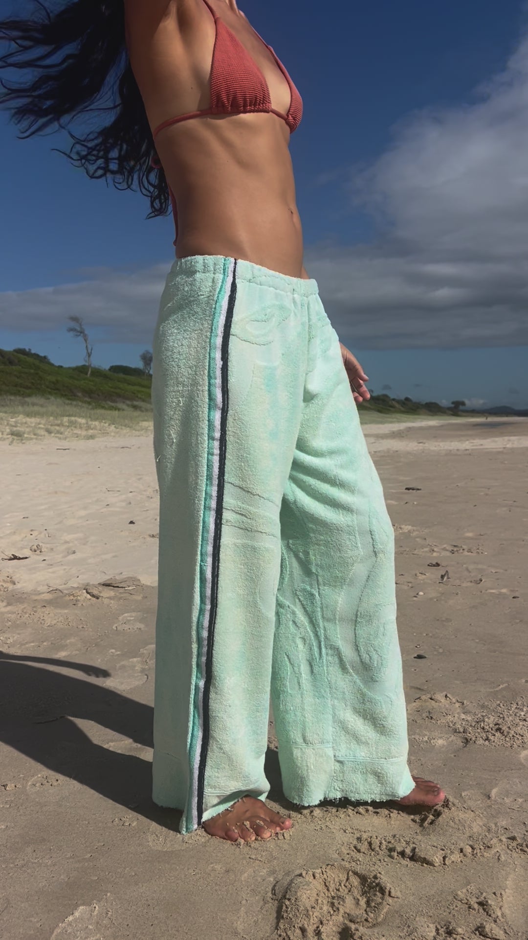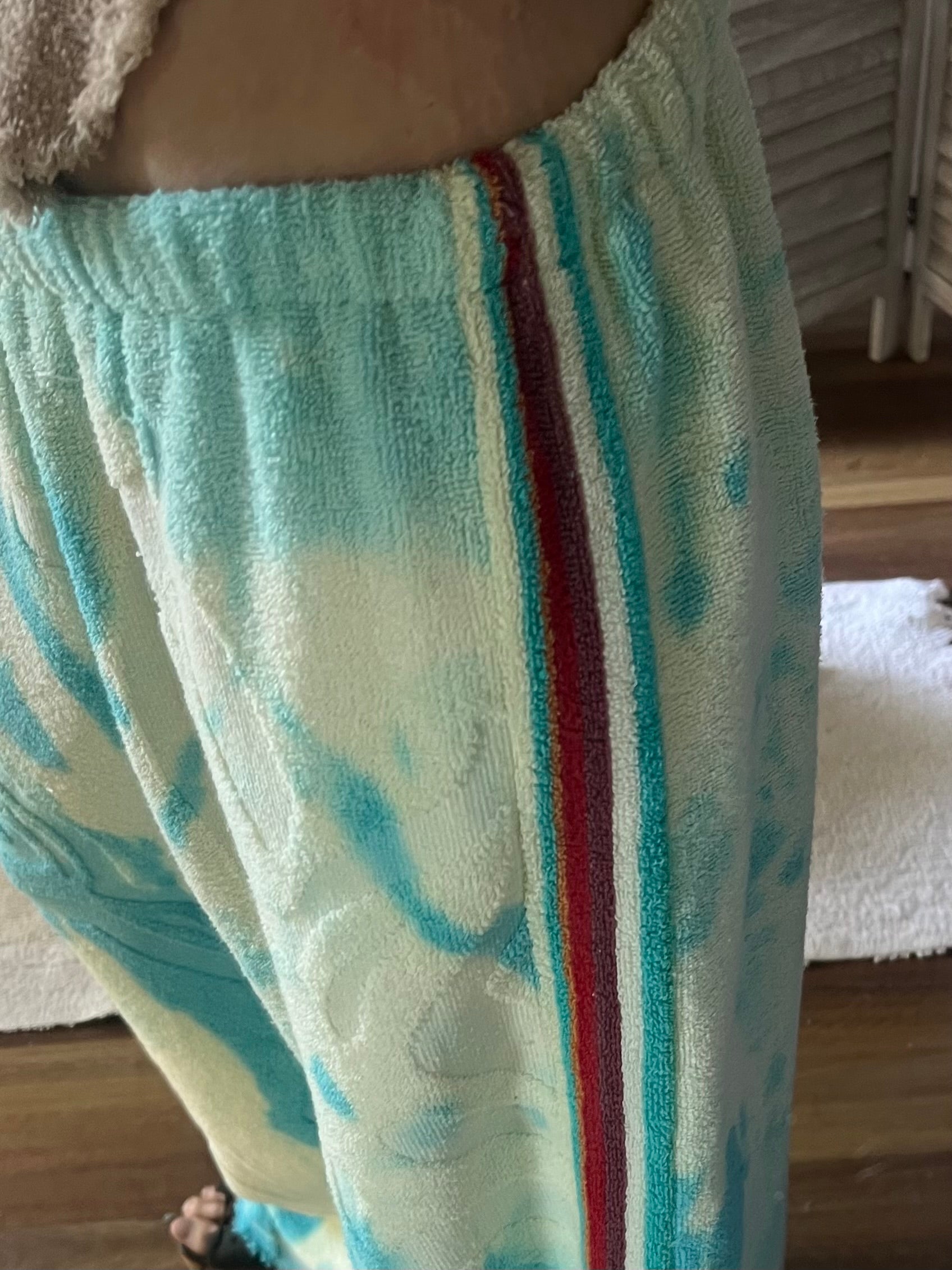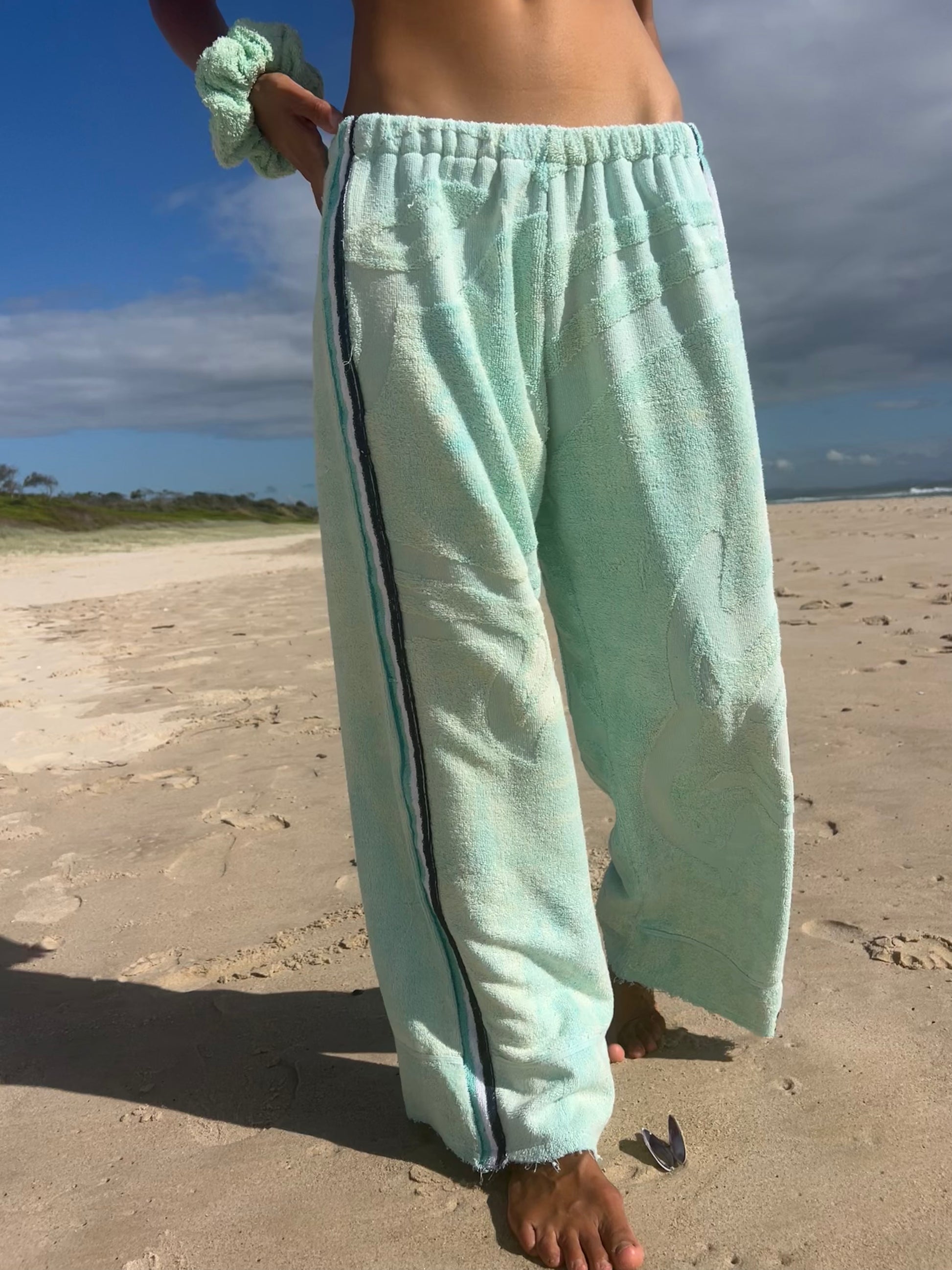 Size M -Petite length Up cycled 100% cotton velour towelling. WAIST RELAXED 39cm *WAIST STRETCHED 54CM *THIGH 37cm *SIDE SEAM LENGTH 95CM. If you are a smaller size, elastic can be adjusted.