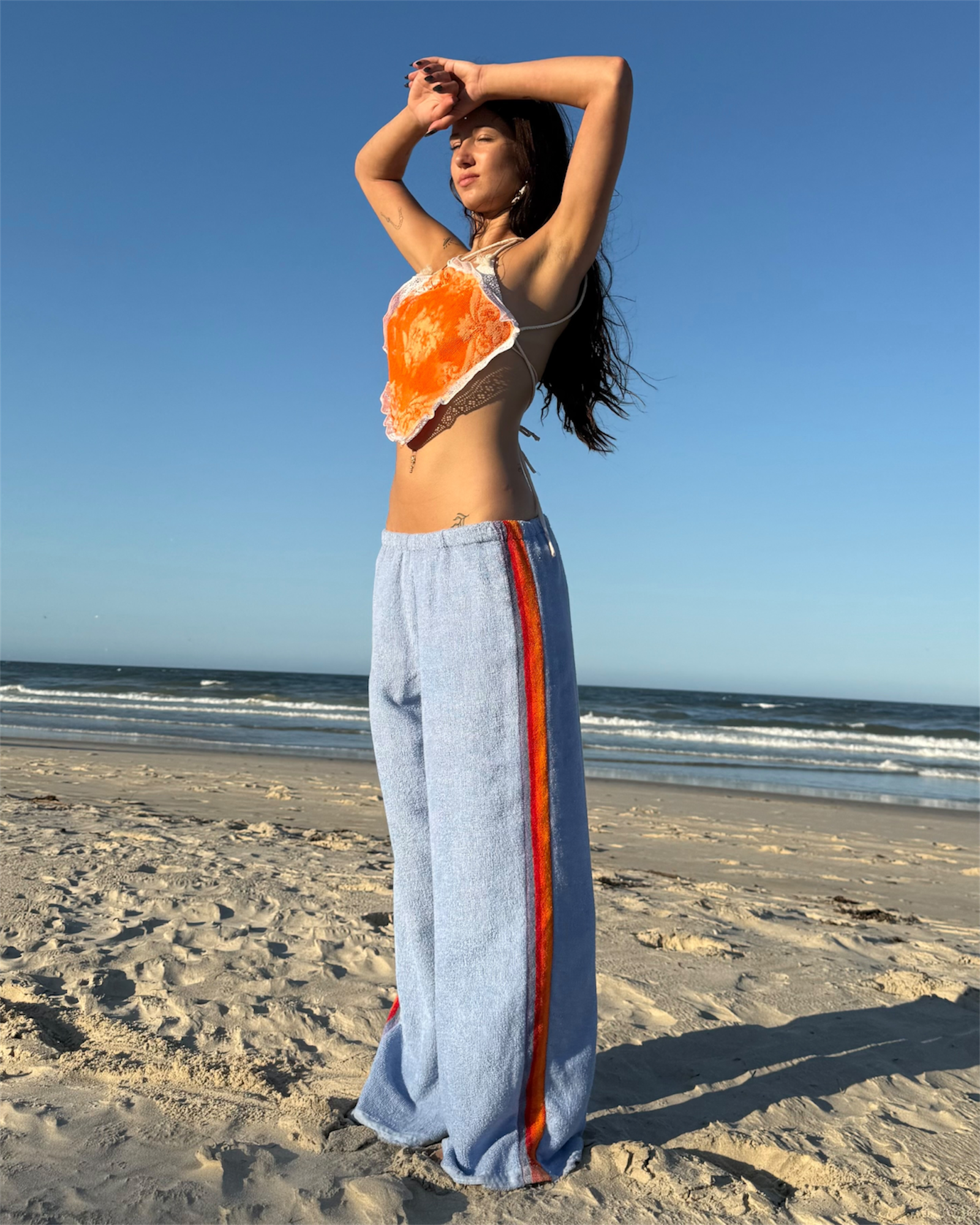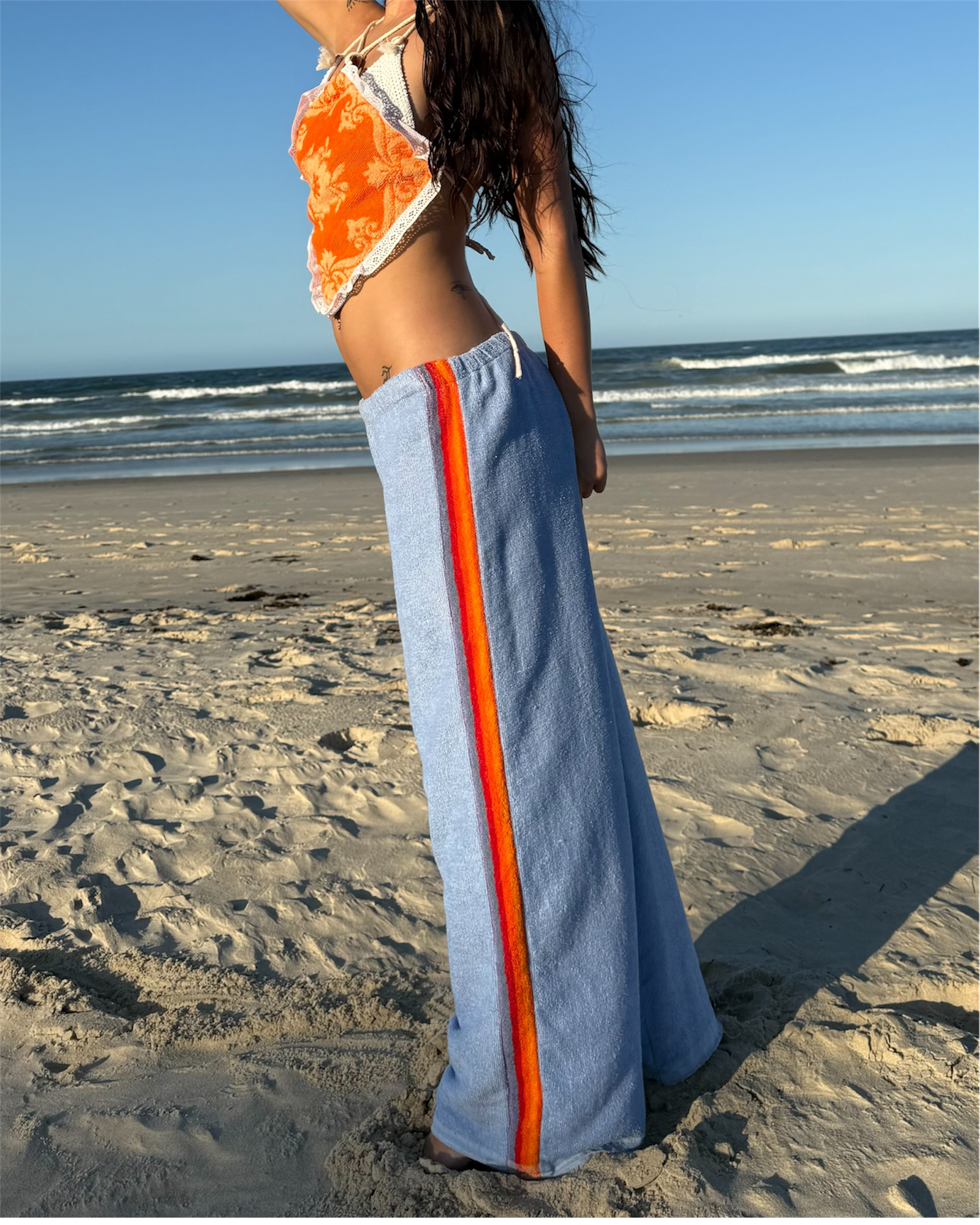 Crafted from 100% cotton, nos (new old stock) towels. these sit low rise. These pants offer a luxurious, tailored feel. With the comfort of non roll elastic, finished with a casing so you can roll them.
