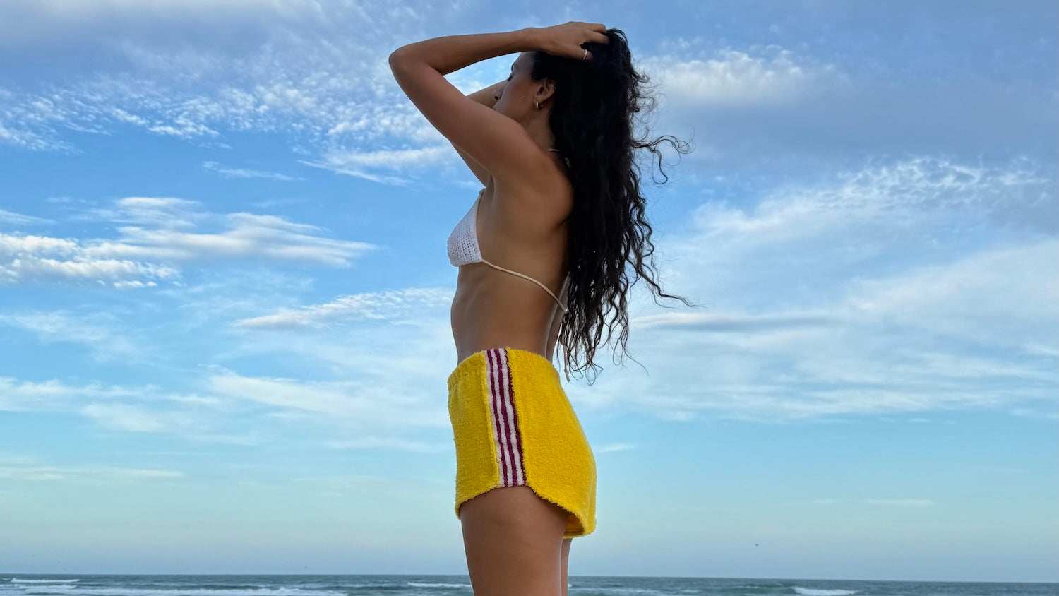 Reworked towel shorts, tailored from 100% cotton reclaimed towels. Elastic waist, wear rolled for hipster-shorter length. Striped side panels.