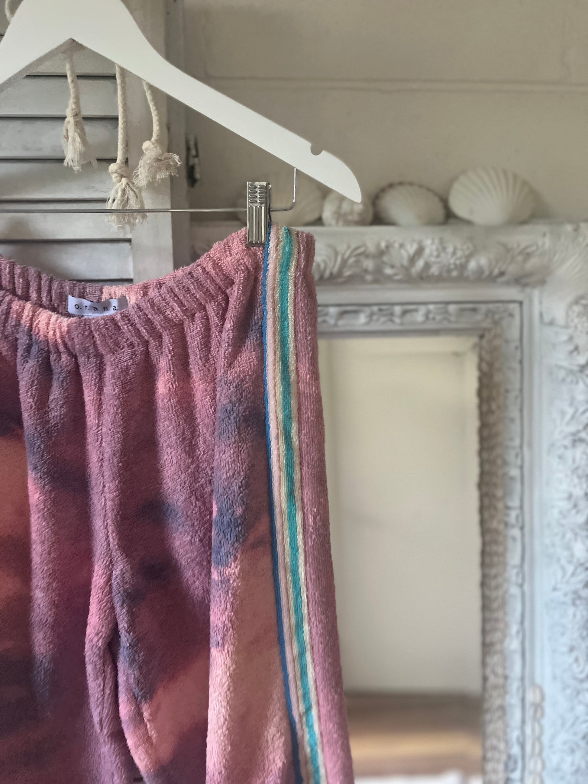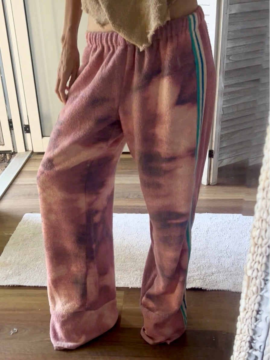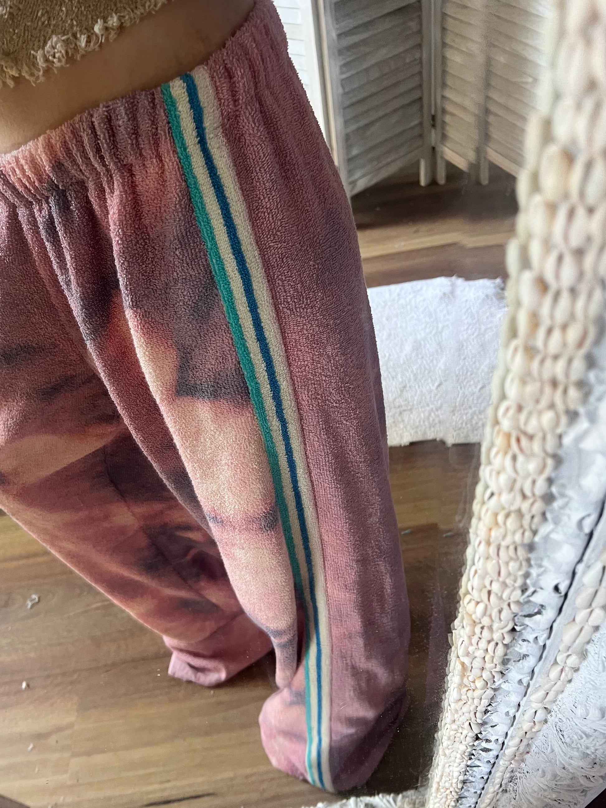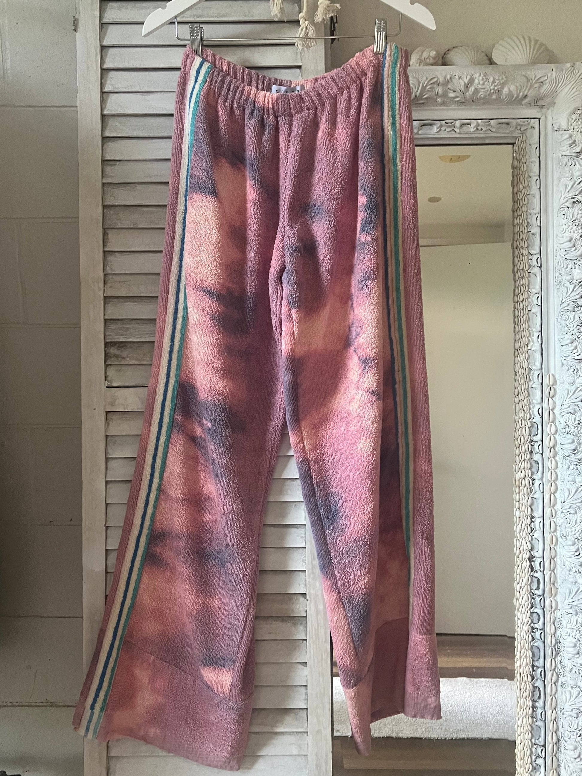 Size M- longer length Up cycled 100% cotton towelling. WAIST RELAXED 37cm *WAIST STRETCHED 52CM *THIGH 37cm *SIDE SEAM LENGTH 103CM.