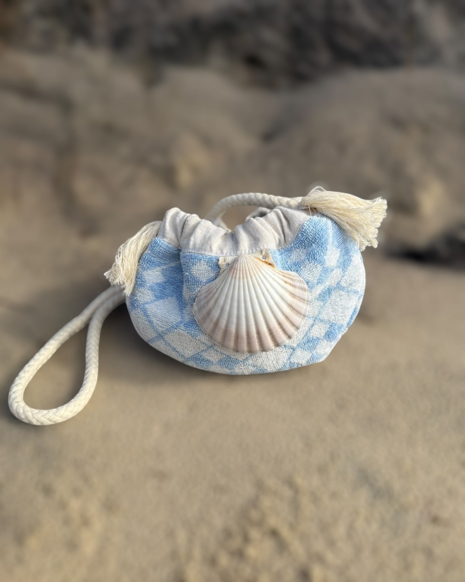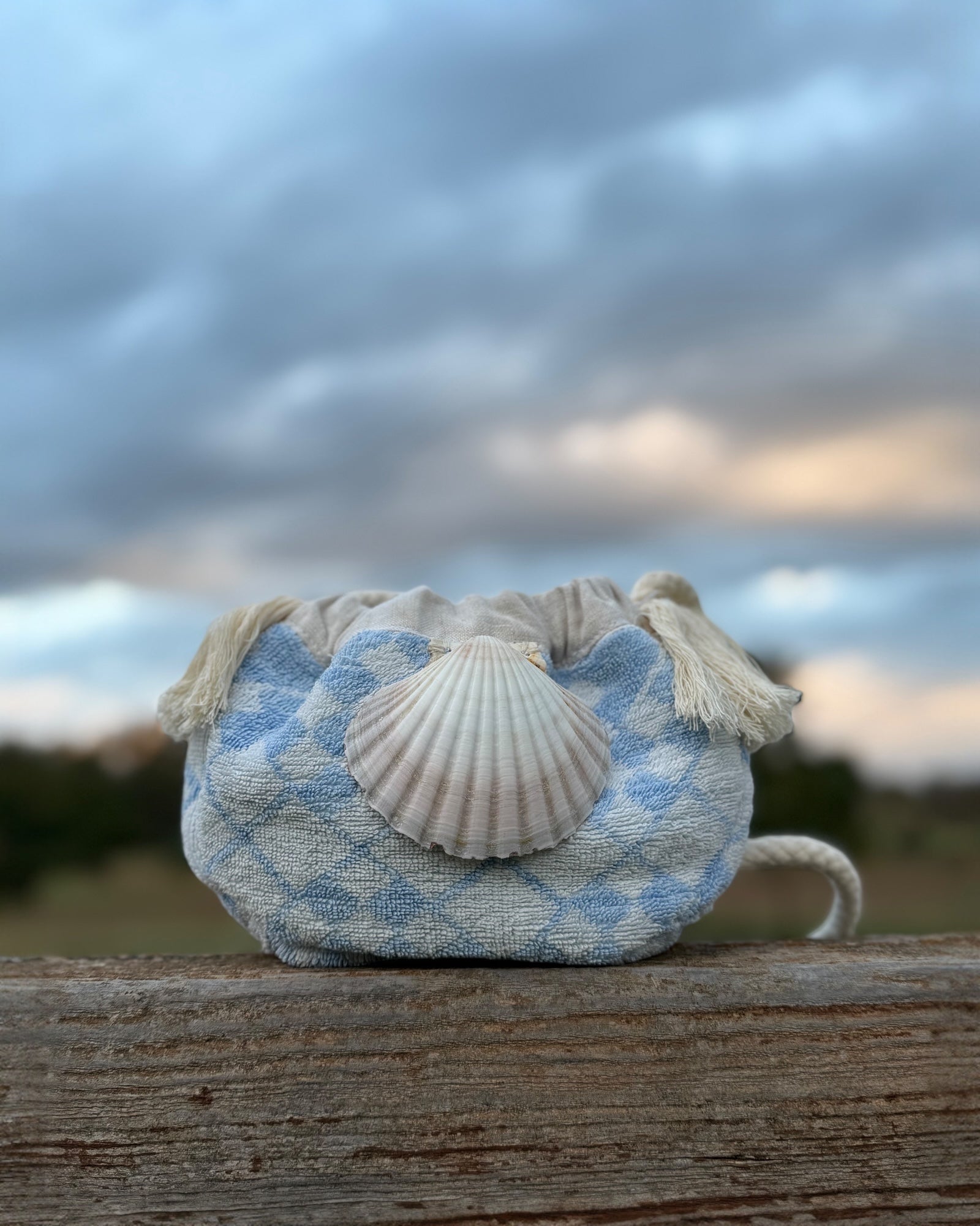 Made using off-cuts from other designs to ensure no vintage textile goes to waste. Fully lined with an elasticated top for easy access, finished with a locally sourced, ethically collected scallop shell, hand fringed rope strap.