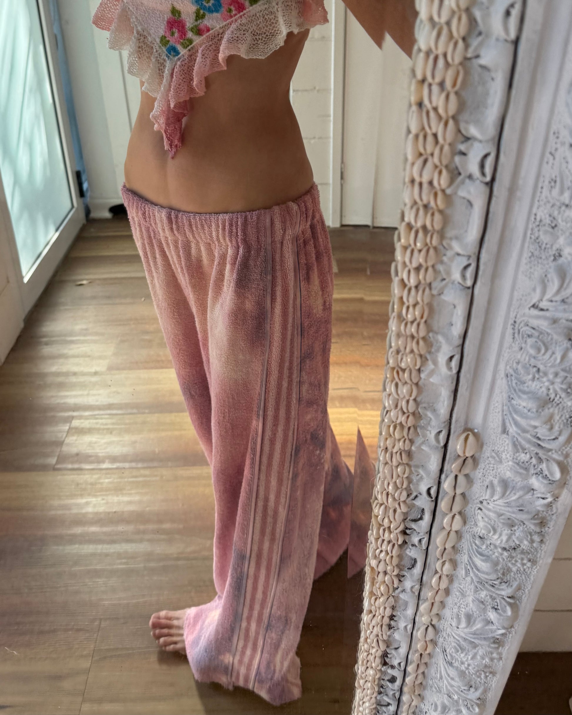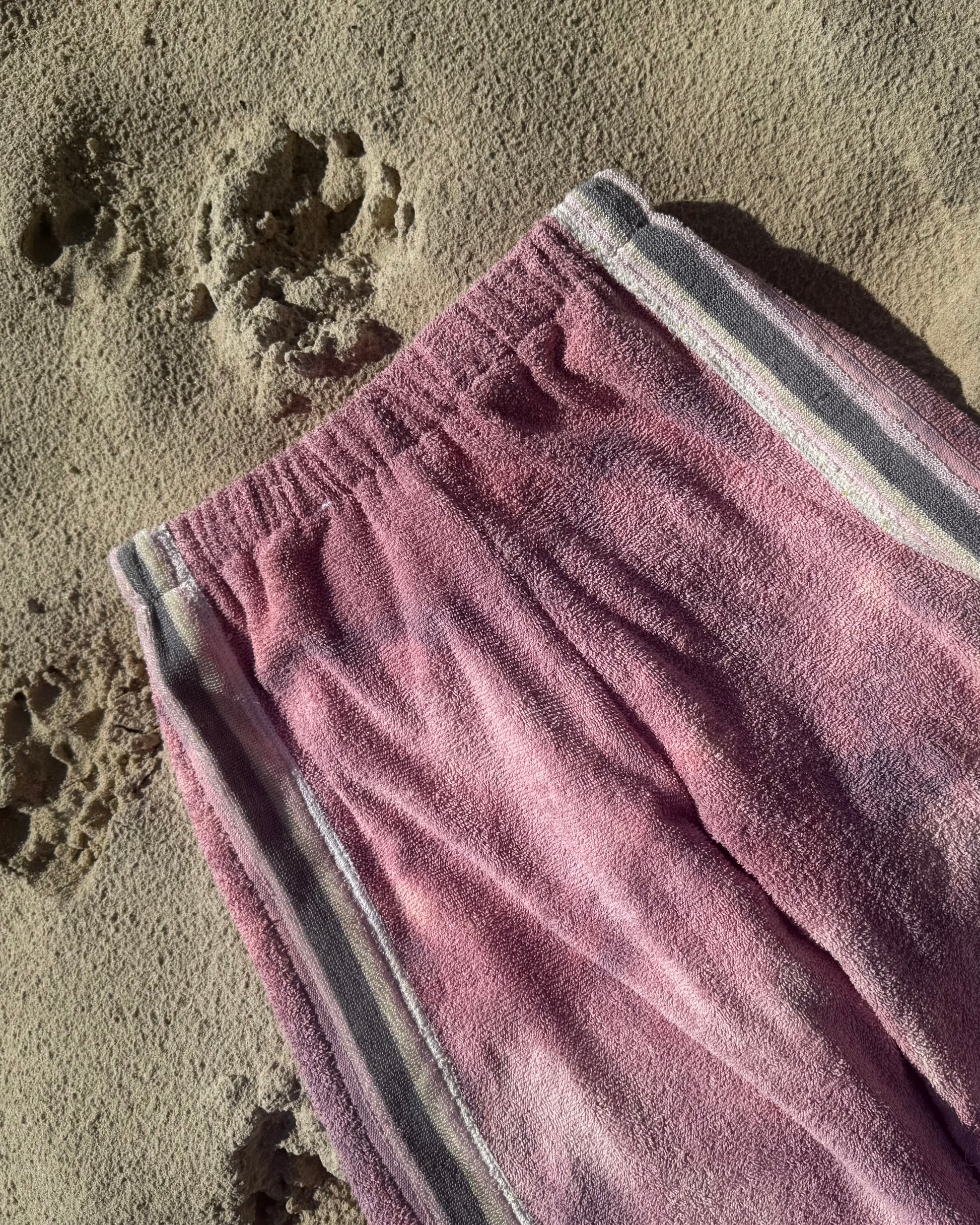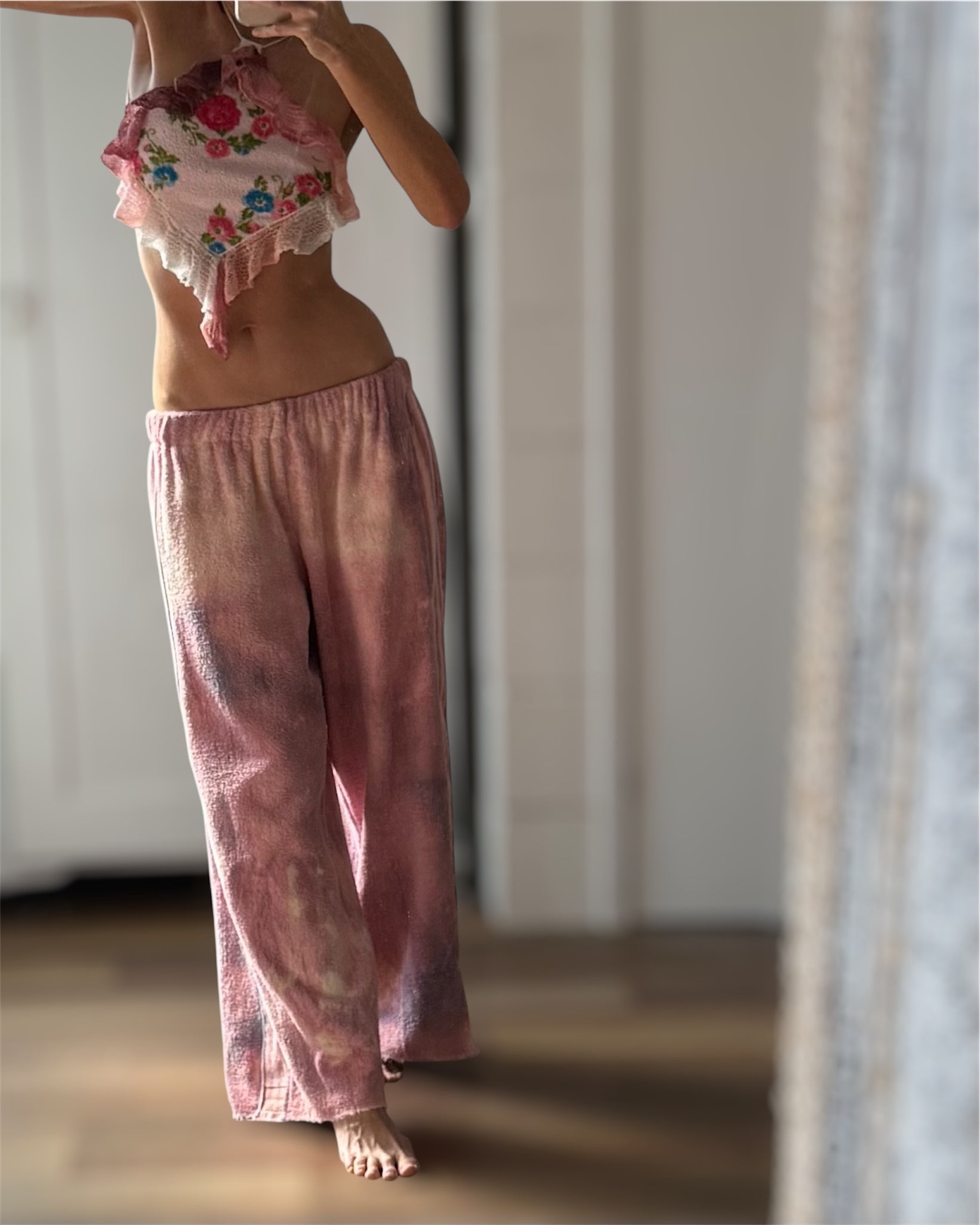 Crafted from 100% cotton, nos (new old stock) towels. Limited by the length of towel, these sit low rise. These pants offer a luxurious, tailored feel. With the comfort of non roll elastic, finished with a casing so you can roll them.