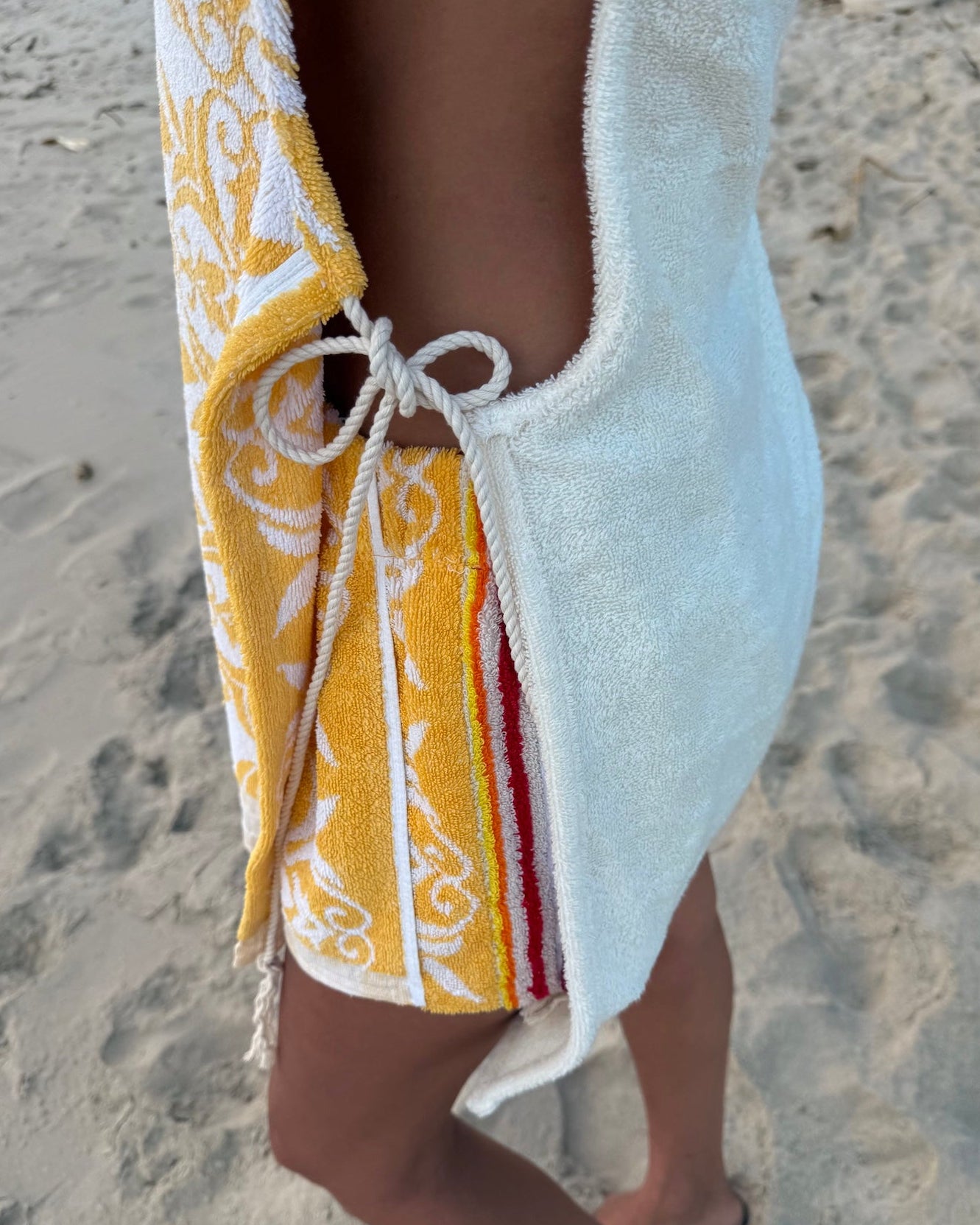One-of-a-kind reworked vintage towel dress/coverup. Made from Rare Vintage mid century 100% cotton. The back is made using NOS sand double back towelling. Open at sides with recycled cord ties with cowrie shells. Double turned edges, so can be worn reversed. These quality towels are heavier- dress weight 650 grams