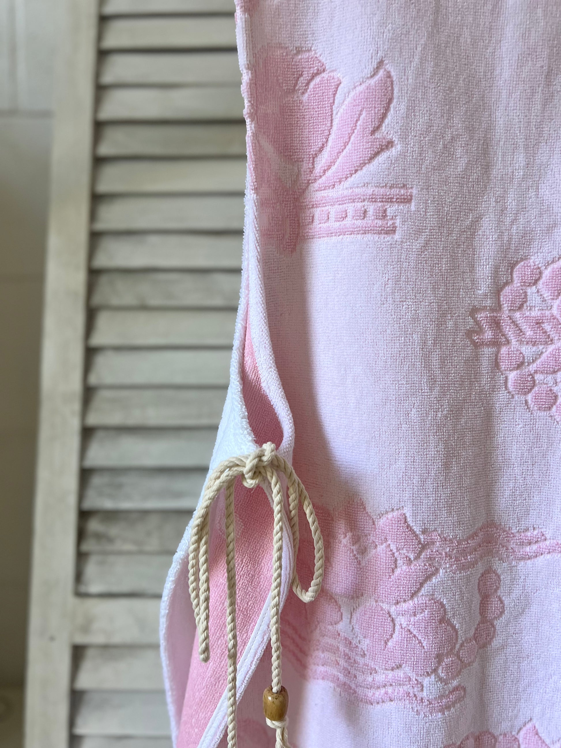 A piece of Italian textile history on the front, with a contrasting New Old Stock (NOS) back. All edges are double-turned, making it fully reversible, so you get the most out of the vintage design. Recycled cotton cord finished with wooden beads. Tie at the sides, or wrap and knot.