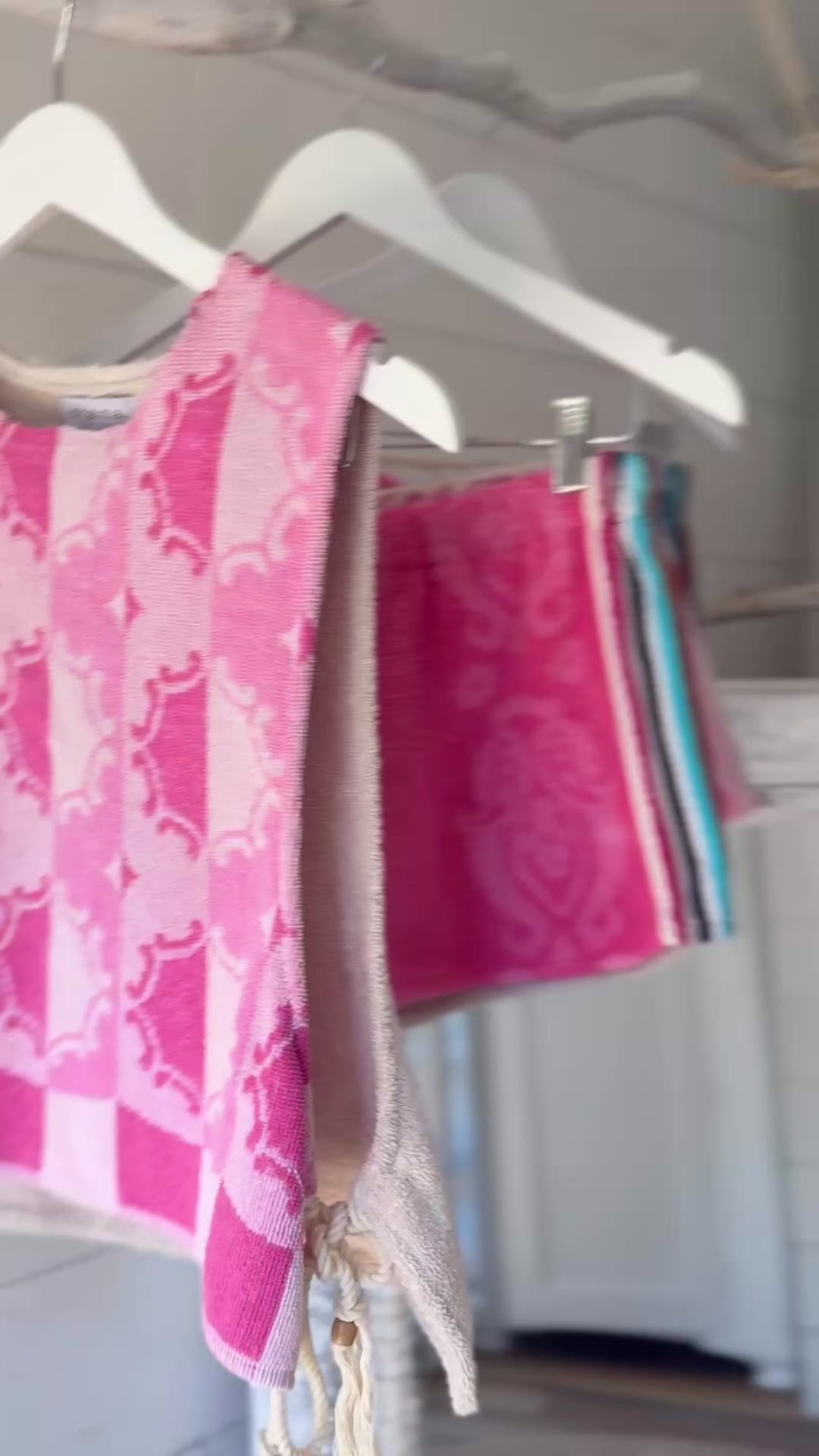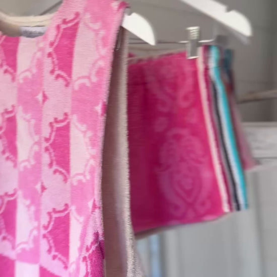 One-of-a-kind reworked vintage towel top, Cut consciously from 100% cotton vntg and reclaimed towels. Open at sides with recycled cord ties with cowrie shells. Double turned edges, so can be worn reversed. Contrast sand towel back.