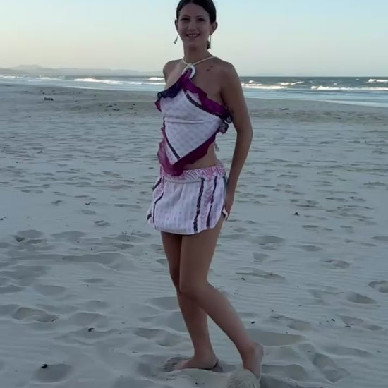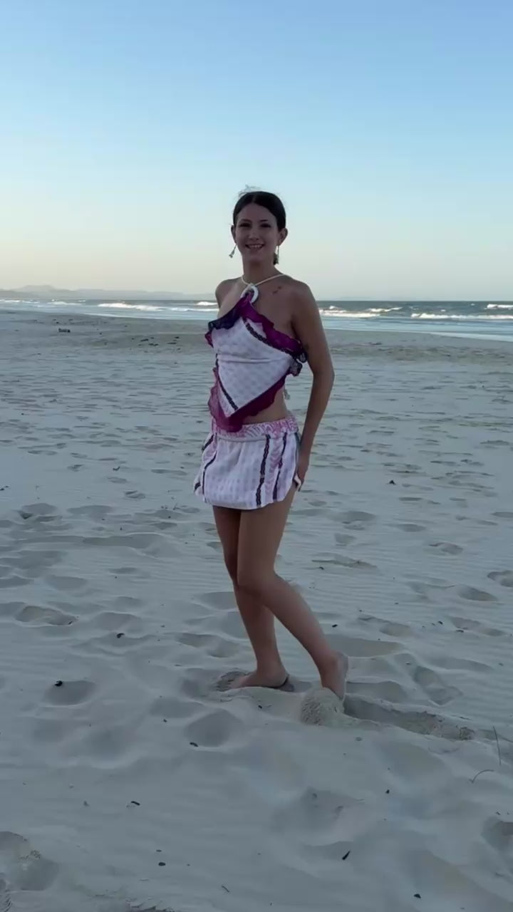 One-of-a-kind reworked vintage towel skirt, tailored from 100% cotton vntg and reclaimed towels. Thick elastic waist, inside vntg cotton casing, worn rolled for contrast band and shorted length. Striped side panels/ shell pink back .