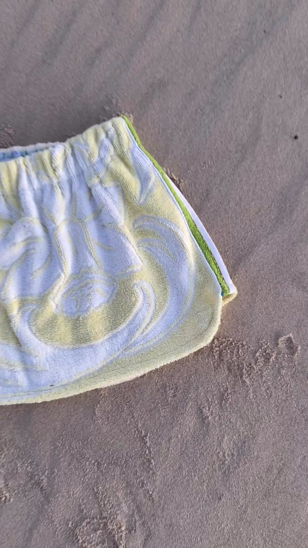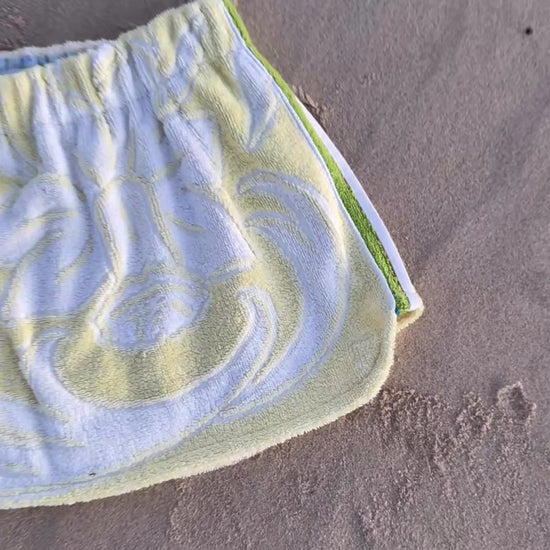 One-of-a-kind reworked vintage towel skirt, tailored from 100% cotton vntg and reclaimed towels. Thick elastic waist, inside vntg cotton casing, worn rolled for contrast band and shorted length. Striped side panels/ cream back .