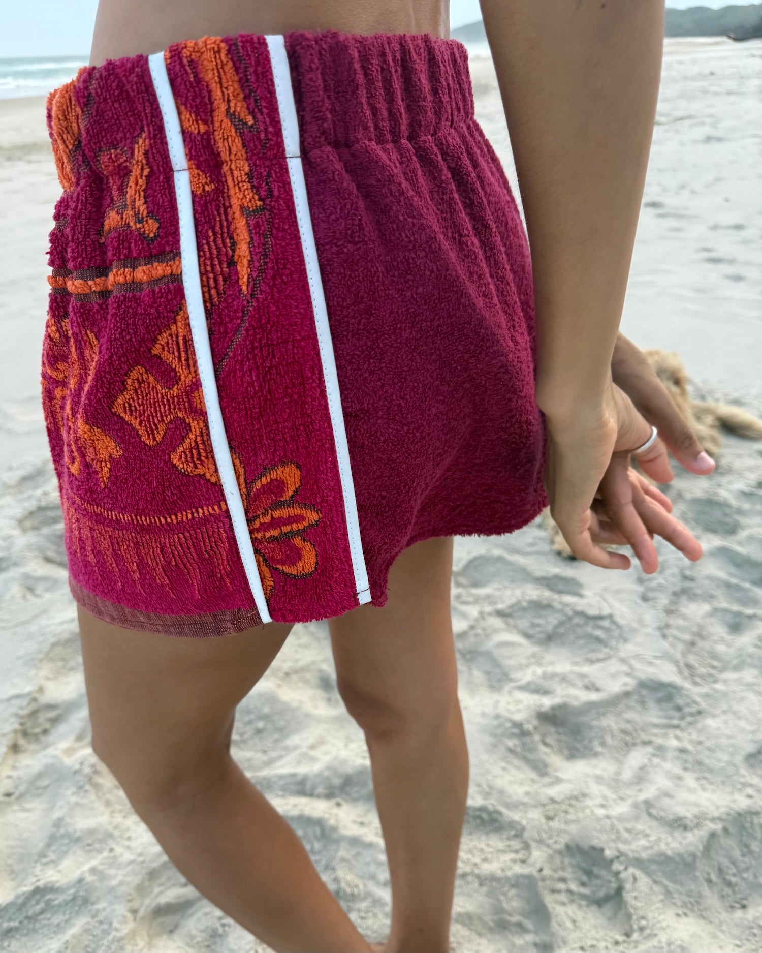 One-of-a-kind reworked vintage towel skirt, tailored from 100% cotton vntg and reclaimed towels. Thick elastic waist, inside vntg cotton casing, worn rolled for contrast band and shorted length. Striped side panels/ shell pink back .