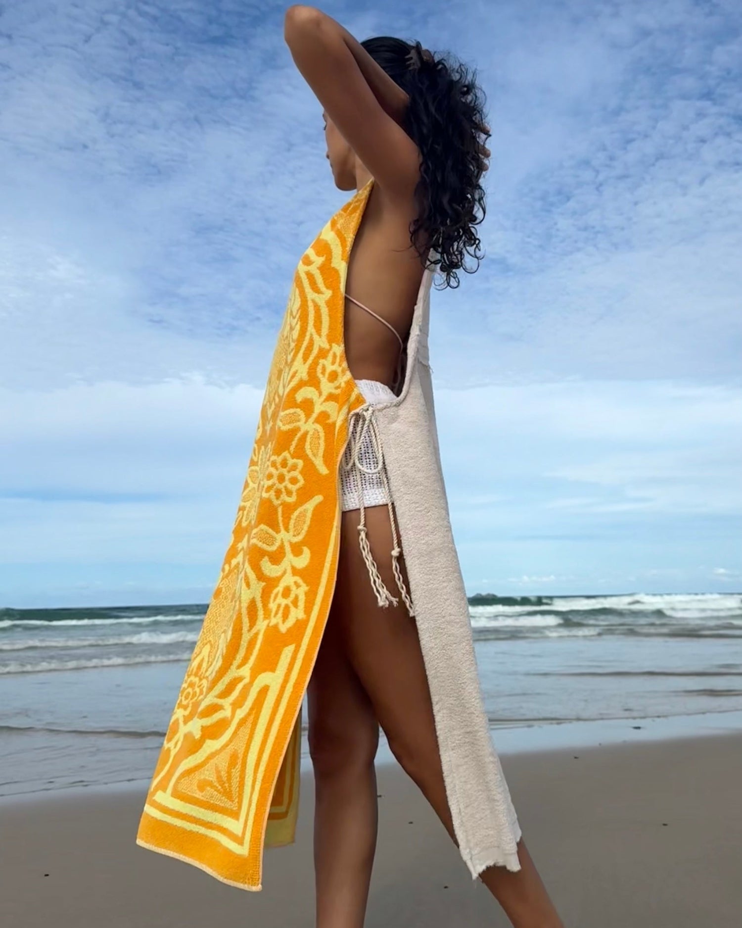 One-of-a-kind reworked vintage towel dress/coverup. Made from Rare Vintage mid century 100% cotton. The back is made using NOS sand double back towelling. Open at sides with recycled cord ties with cowrie shells. Double turned edges, so can be worn reversed. These quality towels are heavier- dress weight 650 grams