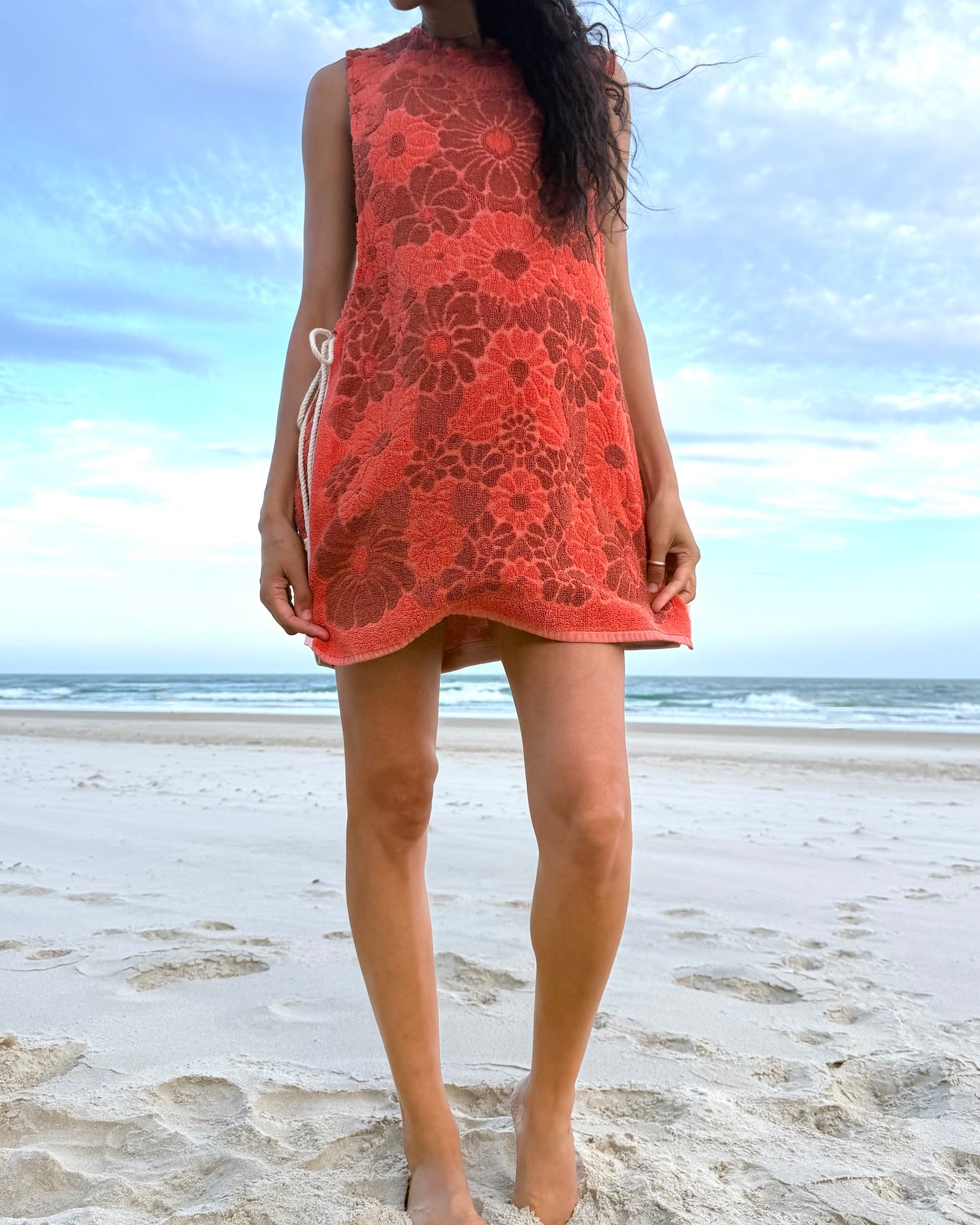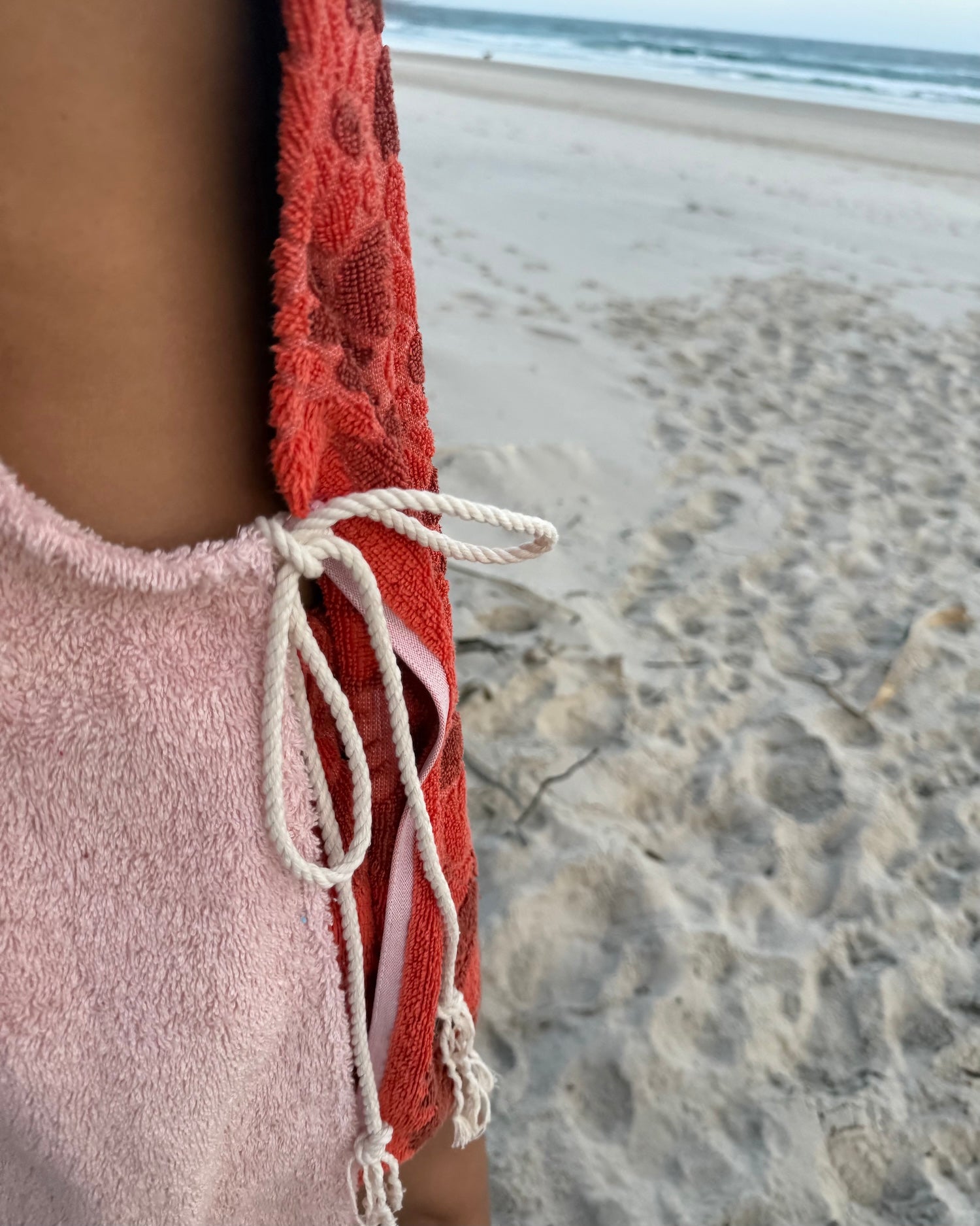 One-of-a-kind reworked vintage towel dress/coverup, Cut consciously from 100% cotton vntg and reclaimed towels. Open at sides with recycled cord ties with cowrie shells. Double turned edges, so can be worn reversed. Contrast dusty pink back.