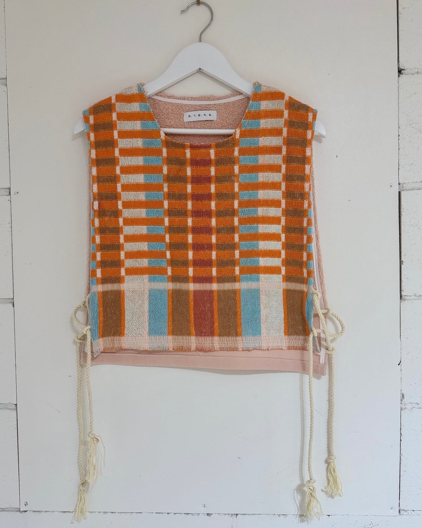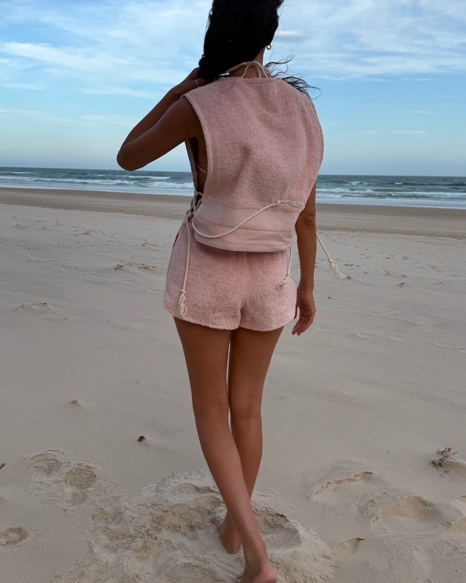 One-of-a-kind reworked vintage towel top, 100% cotton vntg and reclaimed towels. Open at sides with recycled cord ties with cowrie shells. Contrast pink back.