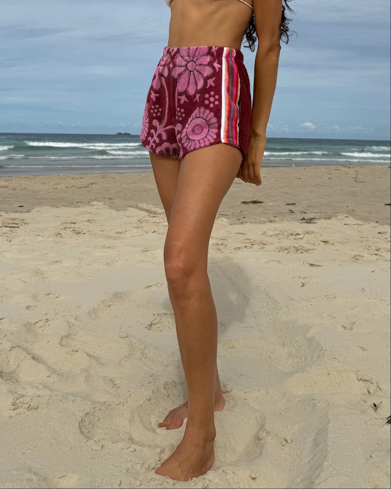 One-of-a-kind reworked vintage towel shorts, tailored from 100% cotton vntg and reclaimed towels. Thick elastic waist, inside vntg 100% cotton casing, worn rolled for contrast band and shorter length. Striped side panels/ burgundy back .